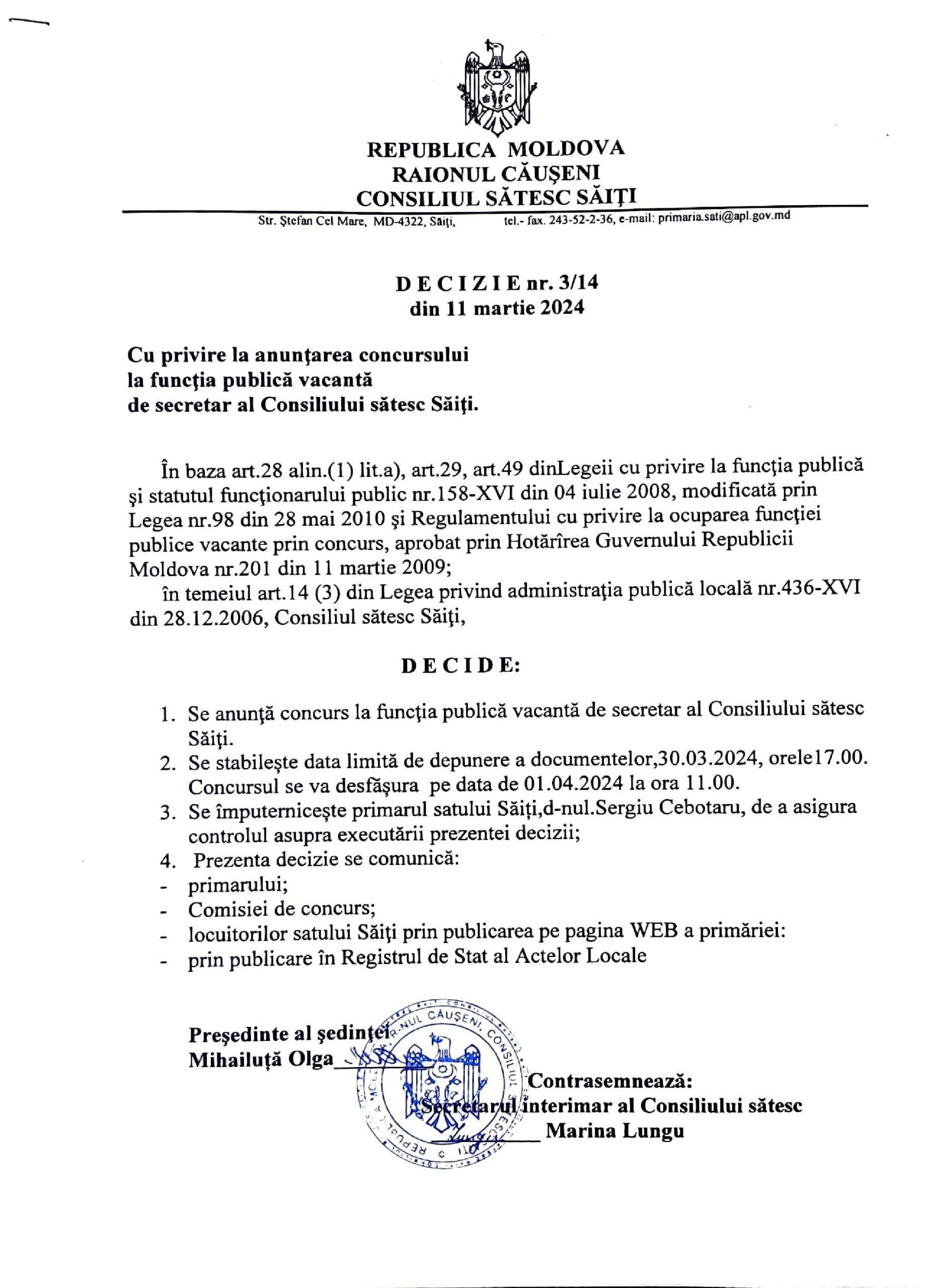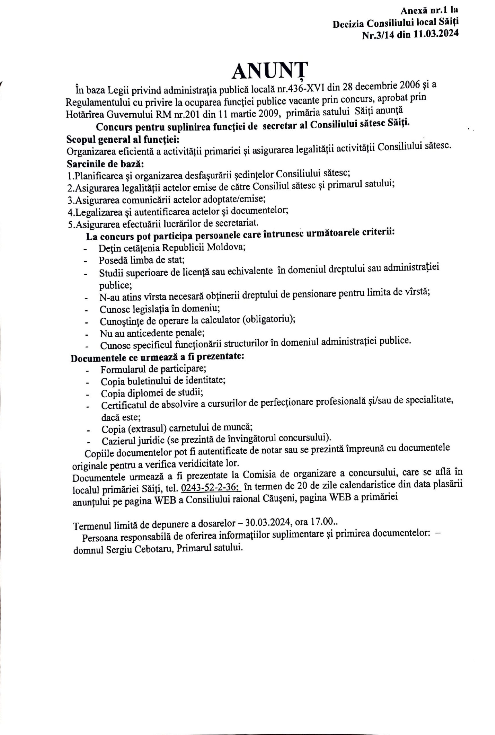 Anunț – Concurs la funcția publică vacantă de secretar al Consiliului sătesc Săiți Decizie nr.3-14. Cu privire la anunțarea concursului la funcția publică vacantă de secretar al Consiliului sătesc Săiți
