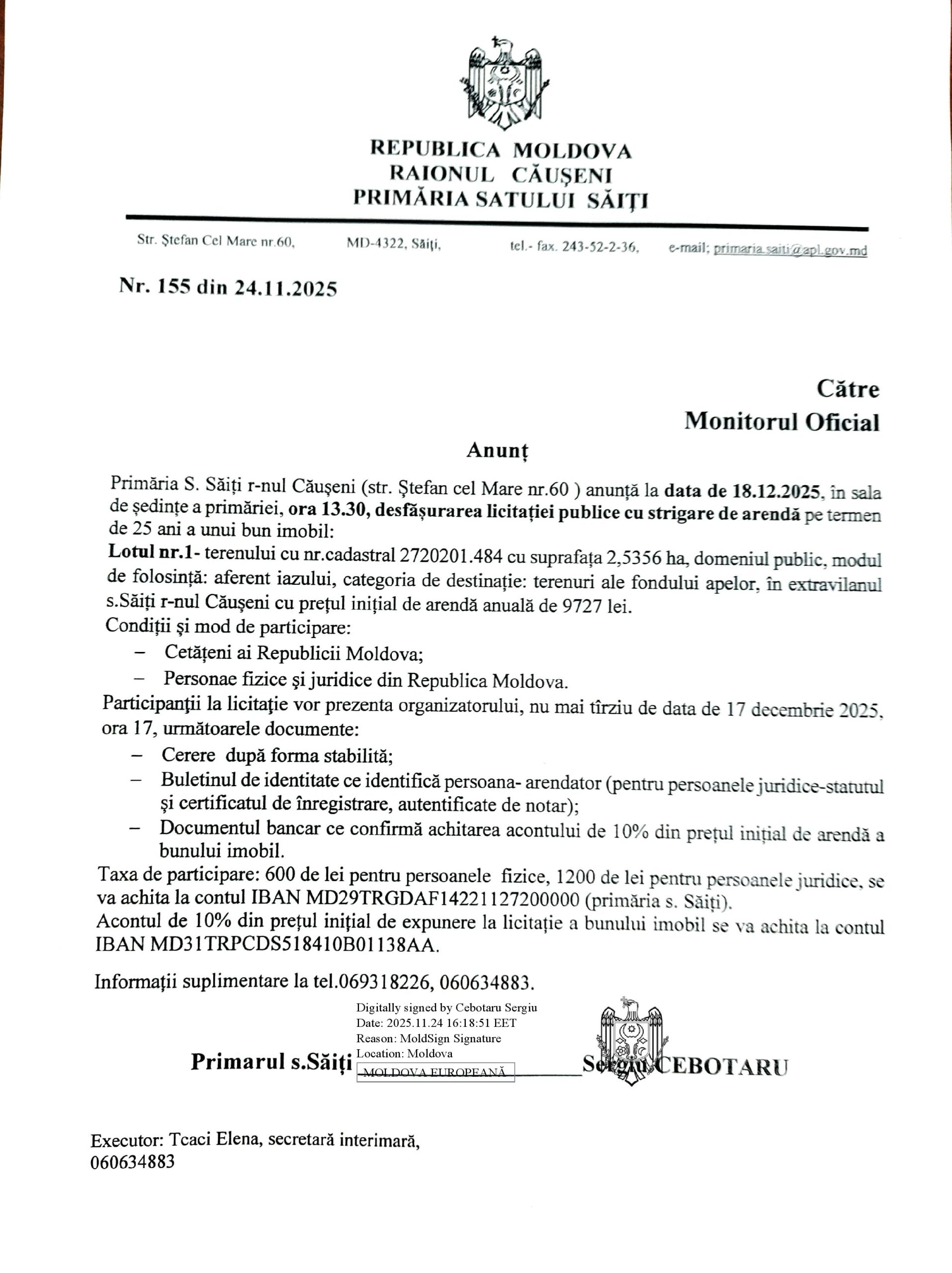 ANUNȚ Licitație publică cu strigare de arendă 18.12.2025