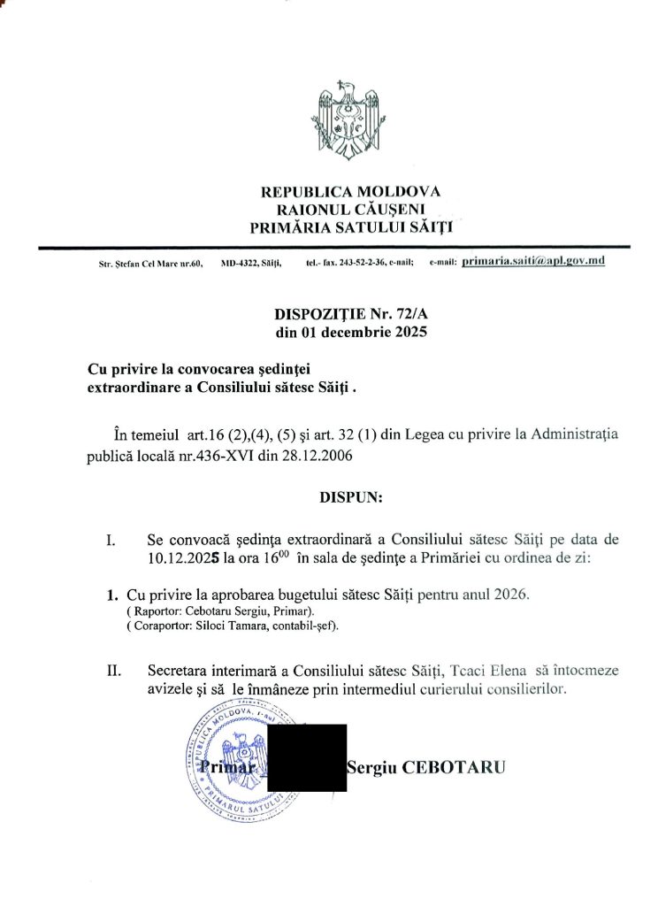 Anunț Cu privire la convocarea şedinţei ordinare a Consiliului sătesc Săiţi