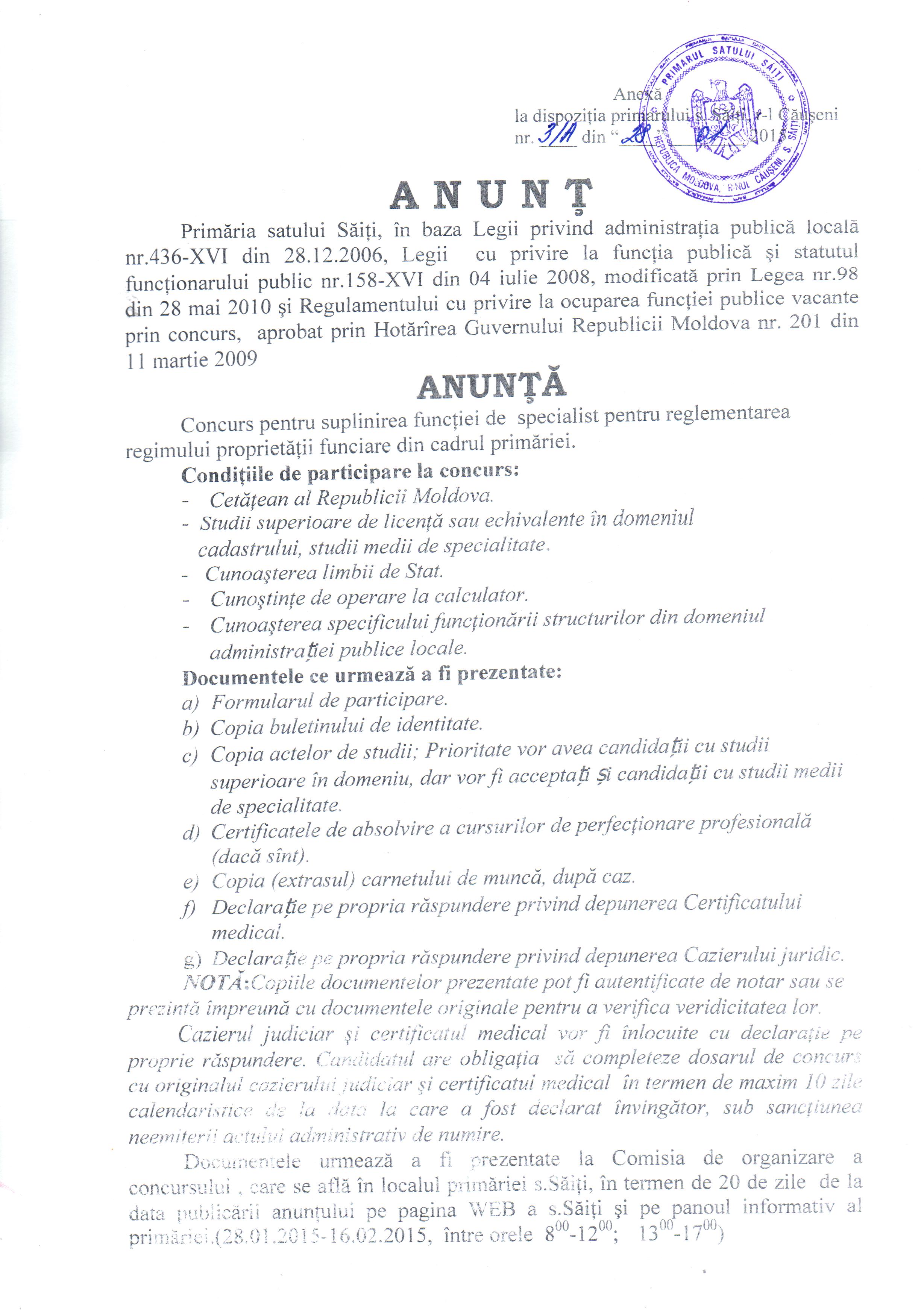A N U N Ţ Primăria satului Săiţi, în baza Legii privind administraţia publică locală nr.436-XVI din 28.12.2006, Legii cu privire la funcţia publică şi statutul funcţionarului public nr.158-XVI din 04 iulie 2008, modificată prin Legea nr.98 din 28 mai 2010 şi Regulamentului cu privire […]
